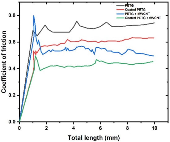 The friction coefficient (μ) was found to rise as the load increased along the length, which reflects the rate for the coating and substrate combination, as mentioned in Figure 19. From the test, it was observed that the pure PETG sample had a high coefficient of friction of 0.8, followed by the coated PETG sample with 0.69, due to a lack of adhesive forces between the layers. The coefficient of friction for the PETG-MWCNT specimen was 0.52, followed by the coated PETG-MWCNT specimen with 0.49; due to the strong hardness of the material, causing high resistance to the indenter, this caused deformation [33].