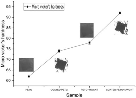 A three-sided pyramidal micro-Vickers hardness indenter was used to determine the hardness of the electroless plated and non-electroless plated substrates. The indentation hardness of the coated composite substrate was the highest at 92 HV. Parameters such as the amount of coating deposition, reinforcements, and their distribution pattern change the hardness values of the samples [34]. Particle strengthening and dispersion strengthening are the two factors that vary the microhardness capacity of the material. The uniform dispersion of reinforcements and coated embedments into the matrix provides the dispersion strength by avoiding the formation of agglomerations [35]. Varying the thickness of the embedments and the amount of reinforcement provides strength to the particles and helps transfer the load between embedments, reinforcements, and matrix. In this study, we observed that the electroless plated samples had noticeably high hardness values by improving the particle strength and offering resistance to plastic deformation. In this work, the pure PETG had a hardness value of 63, which further increased to 18% at 74 for the coated PETG; similarly, the PETG+MWCNT had a hardness value of 76, a 23% increment, and the coated PETG-MWCNT had a 53% increment, with the highest harness value of 92, as shown in Figure 20.