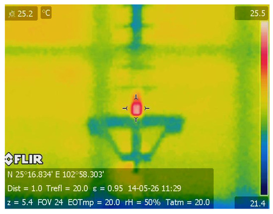 Infrared thermography is a technique for converting infrared energy into electronic signal to produce the temperature distribution of inspected object by non-contact thermal imaging devices [13,14,15]. Owing to its advantages of safety, universal applicability, far-field measurement, large inspection coverage, and being free from electromagnetic interference, infrared thermography has been successfully used for condition monitoring and fault diagnosis of power equipment over decades [16,17,18]. Various kinds of electrical equipment faults, such as loose connection, corrosion, short and open circuits, aging, harmonics influence, internal defects, load imbalance, and overloads, manifest as an abnormal temperature rise, which in turn accelerates the deterioration of equipment. Thus, infrared thermal inspection is a preferred option for preventive and predictive maintenance of electrical components with the abilities of instantly identifying and locating the hot spots and classifying the severity of the problem. A typical infrared thermographic result for defect inspection is provided in Figure 1, which shows an abnormal temperature rise at the high-voltage end of onsite composite insulator. It has been demonstrated that the local heating phenomenon of composite insulator is closely related to internal partial discharge, moisture dielectric polarization, and insulation resistance deterioration of materials [19]. Therefore, it is reasonable to infer that this composite insulator has potential danger of fracture accident and should be replaced at once.