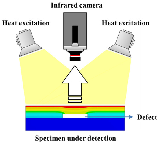Pulsed thermography (PT) employed in this work is one of the simplest, fastest, and most developed AIT techniques. The principle of nondestructive testing process based on pulsed infrared thermography is illustrated in Figure 2. External thermal excitation sources are used to apply pulsed heat flow to the tested specimen, and at the same time, an infrared thermal imager is used to record the changing temperature field of the tested specimen surface. Due to the different thermophysical properties of the defective area and the non-defective area inside the tested specimen, according to the theory of heat transfer, the heat flow spreads non-uniformly inside the specimen, resulting in the surface temperature evolution corresponding to the defective and the non-defective area shows differences. By processing and analyzing the infrared heat map sequence, it is possible to determine the existence of defects and obtain information such as defect location, size, depth, etc. [28,29]. According to Fourier’s law, the thermal conductivity differential equation shown in Formula (1) can be established, and the whole physical process of detection can be regarded as solving the thermal conductivity differential equation after determining the boundary conditions [30]: