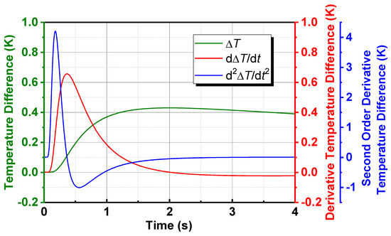 Temperature difference over time and its first and second derivative.