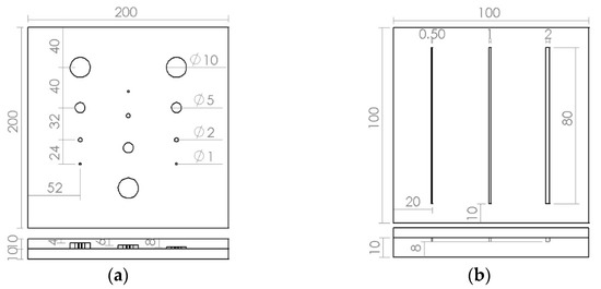 Design drawings of test specimens with artificial defects (unit: mm). (a) Voids in silicone rubber. (b) Cracks in fiber-reinforced plastic.