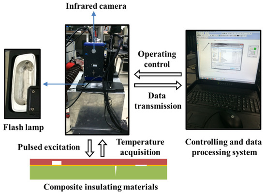 The experimental platform is shown in Figure 5, which consists of a detection device and a control and data processing system. The detection device is equipped with two high-power modulated flash lamps with a light pulse width of 2 ms and a maximum energy of 9600 J. A FLIR SC7000 focal plane array long-wave infrared thermal imager is installed above the detection device. It adopts advanced cooled quantum well infrared photodetector technology and a highly reliable internal circulation refrigerator to reduce noise and provide high-resolution images. The working band of the thermal imager is 3.1~5.6 μm, and it can collect images with a resolution of 640 × 512 pixels. The built-in data acquisition interface of the control and data processing system is connected to the thermal imager to collect infrared thermal wave images and perform image processing and data analysis. The lower part of the control and data processing system charges the capacitor power supply for the flash excitation system and is connected with the detection device through the corresponding interface. In the experiment, the acquisition frequency of the thermal imager was set to 200 Hz and the acquisition time was set to 30 s.