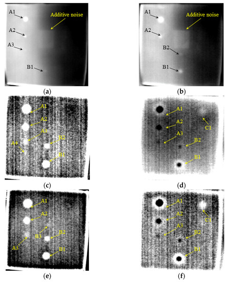 Figure 6 shows the AIT detection results of voids in silicone rubber. In Figure 6a, the 100th frame RTI (acquired at 0.5 s), only defects A1, A2, A3, and B1 can be observed. Defects B1 and B2 can be recognized in Figure 6b, the 300th frame RTI (acquired at 1.5 s), but A3 is not so clear in this frame. This phenomenon indicates that deeper defects appear later in the thermal image sequence because of the heat transfer process. In other words, the optimal time to identify a defect depends on its depth. Smaller or deeper defects cannot be found in RTIs. The square spot in the center of the image which could be seen in Figure 6a,b is the shadow of infrared camera lens. The temperature, which shows in thermal images as grayscale, of left part is higher than the right part of the plate owing to uneven heating. To decrease noise effects and enhance detection performance, DTIs were employed to enhance signal-to-noise ratio (SNR) and recognize the small defects better. It can be observed that additive noise (the shadow of infrared camera lens) and uneven heating were truly eliminated in the first and second order DTIs shown in Figure 6c–f.