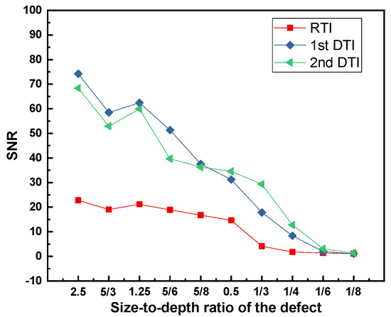 The SNR for each size-to-depth ratio of the defect by employing different processing approaches has been analyzed as shown in Figure 7. This part of the analysis can provide a reference for processing defects with different size-to-depth ratios using different processing methods.