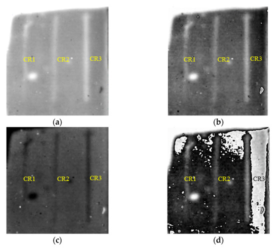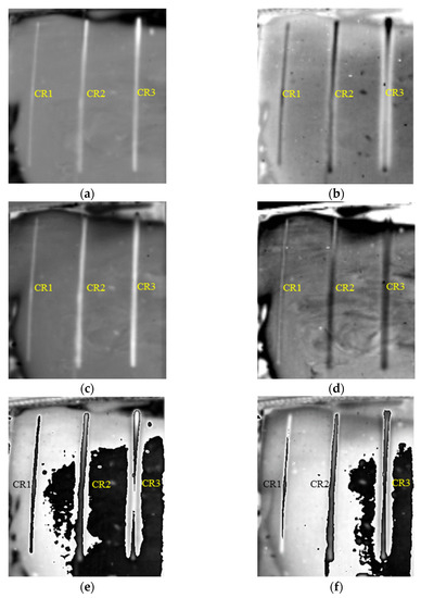 As shown in Figure 9, all three cracks (CR) below 1 mm thick SIR can be clearly identified in both the first and second order DTIs. The defect identification is further improved by subtracting the two 1st and 2nd DTIs respectively before and after the grayscale inversion as shown in Figure 9e,f.
