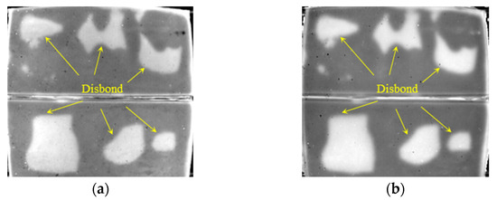 Detection results of disbond with 3 mm thick SIR. (a) The 1898th frame 1st DTI. (b) The 1046th frame 2nd DTI.