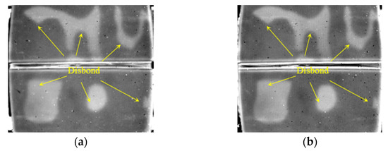 Detection results of disbond with 2 mm thick SIR. (a) The 829th frame 1st DTI. (b) The 1144th frame 2nd DTI.