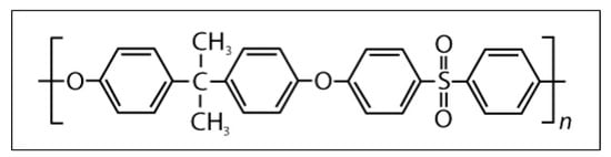 Polysulfone (PSU) is a high-temperature rigid plastic with high mechanical strength. It is remarkably strong over a wide range of temperatures and has good resistance to hydrolysis, excellent stability, and good chemical compatibility. It has a density between 1.24 and 1.25 g/cm3 and is a repeating unit, as shown in Figure 1 [,,,,]. Table 1 summarizes the PSU element fractions.