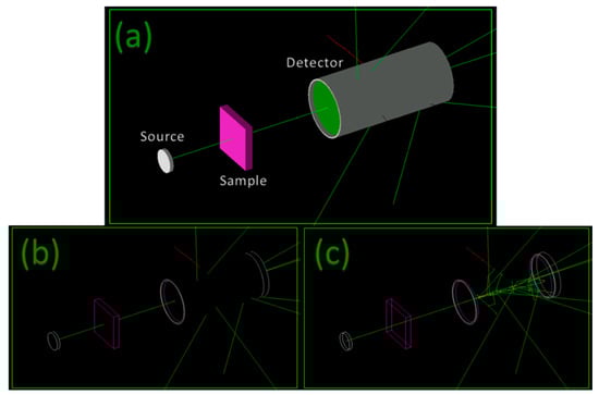 Geant4 visualization of the developed code. (a) Solid surface view, (b) wire frame view, (c) hidden edges view.