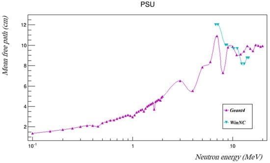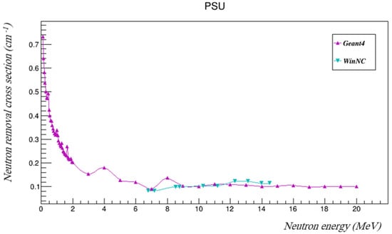 The neutron removal cross-sections of PSU were found using Geant4. In order to validate the results, they were compared to removal cross-sections measured using the WinNC toolkit, which is a database used to estimate the neutron removal cross-sections of materials []. Table 6 summarizes the removal cross-sections and mean free paths as found using Geant4 in the investigated energy range, and those found using WinNC at the available energy intervals are tabulated in Table 7. The removal cross-sections found using both Geant4 and WinNC are plotted in Figure 7, and the mean free paths are shown in Figure 8.