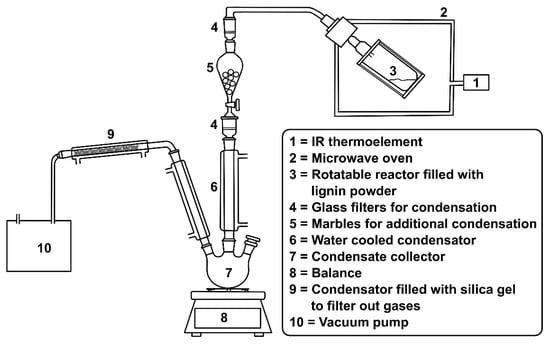 Summarizing, it has to be said that the bio-oil yield in this publication was significantly lower than some previously reported values. However, the low process temperature and the high specific monomer yield can be an advantage over other methods. Additionally, unlike in many other publications, no catalyst or microwave-absorbing material were used, which could further simplify the process. Economic considerations, as well as the desired products, could be crucial factors for the selection of one of the processes.