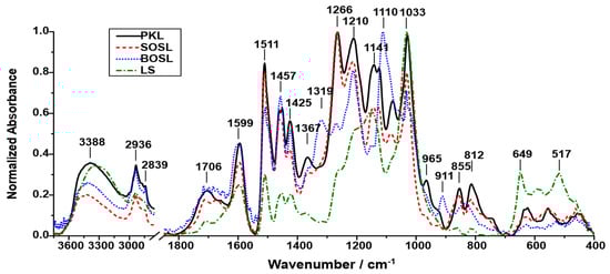 Normalized FTIR spectra of the four untreated technical lignins: LS (green; dashes–dots); BOSL (blue; dots); SOSL (red; dash); PKL (black; solid line).
