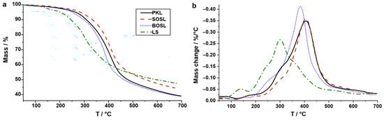 The highest mass loss of the SOSL and PKL occurred at similar temperatures of approximately 405 °C. The BOSL had the highest decomposition rate at approximately 385 °C. As described above, the decomposition of the LS mainly occurred at lower temperatures, with the maximum occurring at approximately 290 °C.