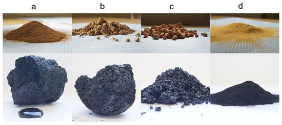 Due to the applied vacuum and gaseous products acting as carriers, small quantities of lignin powder were transferred to the condensation system, which were separated during the liquid–liquid phase extraction step. The phenolic fractions of the different lignins had a dark brown color and a strong odor. The aqueous phases had a light brown color. The pyrolysis char had different appearances depending on the lignin type (Figure 4). The LS char was obtained as a dark powder; optically, compared to the original lignin, only the color changed (Figure 4d). The BOSL char was obtained as larger, dark, glassy particles (Figure 4c). The SOSL and PKL chars were obtained as foam-like, porous solid materials (Figure 4a,b). At the bottom of the PKL char, a glass-like layer formed.