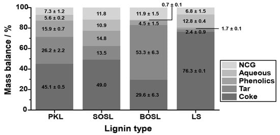Comparing the three softwood lignins, an important factor on the mass balance could be the molecular mass. Kraft and organosolv lignins usually have a significantly lower molecular mass than lignosulfonates []. For smaller molecules, fewer bonds have to be cleaved to obtain phenolic chemicals that can be obtained as condensates. This could explain the high amount of coke for the LS as well as the higher phenolic yields for the BOSL, SOSL, and PKL. However, the phenolic yield of the BOSL was much lower than that of the PKL and SOSL. This indicates that the molecular mass was only one of many influences on the obtained products. Due to the hardwood origin of the BOSL, the structure of it was different to the SOSL, which was probably the reason for the different mass balances. In general, due to the lower reactivity of the S-type lignin, the natural hardwood lignins were more linear than the softwood lignins and contained fewer C-C bonds []. However, the characteristics of hardwood and softwood lignins after organosolv treatment depend on the treatment conditions and can vary significantly []. Thus, it is difficult to generally compare softwood and hardwood organosolv lignins. Considering the obtained results, the main difference between the organosolv lignins was that for the BOSL, a much larger tar fraction was obtained instead of the phenolics and aqueous phases.