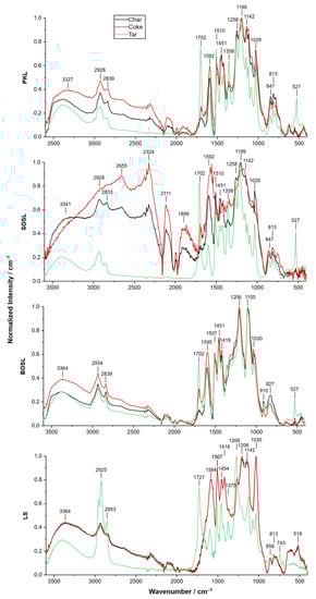 Normalized FTIR spectra of the chars (black), cokes (red), and tars (green) of the PKL, SOSL, BOSL, and LS.