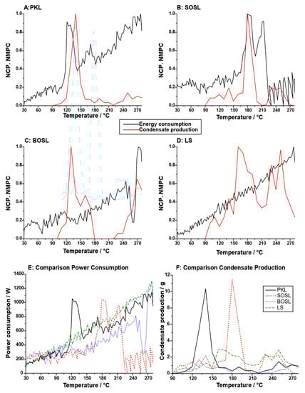 Normalized condensate production (NCP; red) and normalized microwave power consumption (NMPC; black) of the (A) PKL, (B) SOSL, (C) BOSL, and (D) LS as well as (E) a comparison of the microwave power consumption/W and of (F) the condensate production/g for the PKL (black; full line), SOSL (red; dashes), BOSL (blue; dots), and LS (green; dashes–dots).
