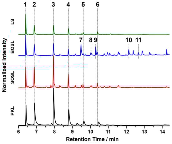 GC-MS chromatograms of the bio-oils won from the four technical lignins: PKL, SOSL, BOSL, and LS. The numbers in the figure refer to the proposed assignments in Table 3.