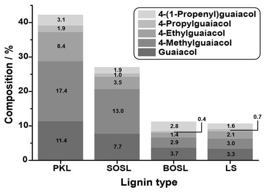 The main reason for the more diverse composition of the bio-oil of the BOSL was the composition of the hardwood lignins. While softwood lignin is often mainly built from G-type precursors, the additional S-type precursors in hardwood upon cleavage produce compounds such as syringaldehyde or 2,6-dimethoxyphenol. These chemicals have both ortho-positions occupied with methoxy groups, as is also the case in the precursor of S-type lignin: sinapyl alcohol [].