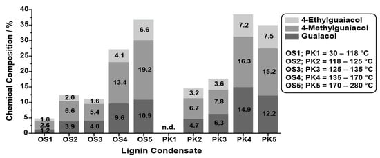 For further insight into the pyrolysis process, condensate samples were collected at different temperatures during the pyrolysis process (Figure 10). The GC-FID chromatograms of the temperature-dependent condensates are depicted in Figure A2 and Figure A3 in Appendix A. The lignins selected for these experiments were the SOSL and PKL due to the fact of their high phenolic fraction yield. The amounts of 4-ethylguaiacol, 4-methylguaiacol, and guaiacol, the three main components of the phenolics, in the condensates were compared. For the SOSL, the general trend was that at higher temperatures, the condensate contained a higher amount of the selected monomers. The only exception was a higher monomer yield at 118–125 °C compared to the yield at 125–135 °C.