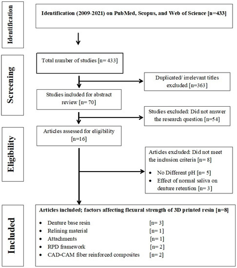The focused study question was: Does salivary pH affect the mechanical and surface properties of RDP? Published articles included in this review reported the original study results that assessed the effect of salivary pH on the properties of materials used for RDP fabrications. A PRISMA (Preferred Reporting Items for Systematic Reviews and Meta-Analysis) guideline was followed to conduct this review (Figure 1) [32].