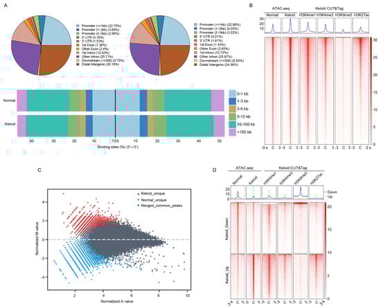 Comparative analysis of chromatin accessibility landscape between dermal fibroblast (DF) of keloid and normal skin tissues. (A) Genomic feature distribution of accessible, namely nucleosome-free, chromatin regions in normal (upper left panel) and keloid (upper right panel) DF. The bottom panel provides a stack plot illustrating the proportions of different sets of accessible chromatin regions stratified by their distance to the gene’s transcriptional start site (TSS). (B) Signal profiles of ATAC-seq in normal and keloid DF and CUT&Tag-seq of a series of histone modifications in keloid DF across the accessible chromatin regions that annotated as “distal intergenic” in normal and keloid DF. (C) MA-plot illustrating the normalized mean ATAC-seq signal values of keloids and normal DF (A values in X-axis) and log2-based ratio of ATAC-seq signal values of keloid DF to normal DF (M values in Y-axis) across the combined accessible chromatin regions in normal and keloid DF samples. Red and blue dots represent chromatin regions that are accessible only in keloids and normal DF, respectively. Dark grey dots are the merged chromatin regions of overlapped accessible regions in normal and keloid DF. (D) Signal profiles of ATAC-seq in normal and keloid DF and CUT&Tag-seq of a series of histone modifications in keloid DF across the differentially accessible regions stratified by their accessible state in keloid DF relative to normal DF. Keloid_down and keloid_up represents chromatin regions that are significantly tighter and looser in keloids than normal samples, respectively.