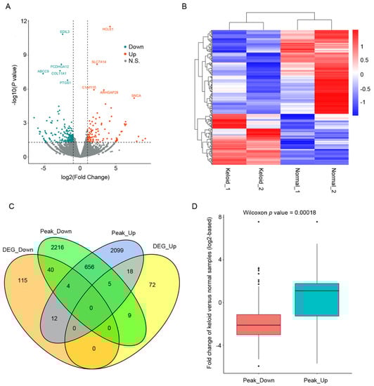 Integrated analysis of chromatin accessibility and transcriptional landscape uncovered influence of chromatin state transformation on gene expression alteration in keloid formation. (A) Volcano plot showing the log2-based fold change (X-axis) and significance (Y-axis, −log10 (p value)) of differential gene expression analysis between keloids and normal DF samples. Blue and red dots represent genes that are significantly down- and upregulated in keloid DF relative to normal DF, respectively. Dark grey dots are non-significantly differential expression genes. (B) Heatmap illustrating the z-score normalized expression values of the differentially expressed genes (DEGs) in normal and keloid DF samples. (C) Overlaps between DEGs and differentially accessible chromatin region-associated genes stratified by their changes in keloid DF relative to normal DF. Peak_Down and Peak_Up represent genes annotated by chromatin regions that are tighter and looser in keloid DF compared with normal DF, respectively. DEG_Down and DEG_Up are genes that are significantly down- and upregulated in keloid DF compared with normal DF, respectively. (D) Distribution of log2-based fold changes of Peak_Down and Peak_Up genes in keloid DF relative to normal DF.