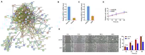 Suppressed BRCA1 expression is a potential pathogenic factor in keloid. (A) Protein–protein interaction (PPI) network of DEGs based on STRING database. More lines between two genes indicates more reliable interactions between them, and line color represents evidence type for their interaction. BRCA1 as a hub gene, i.e., highly connected in the network, is highlighted by a red arrow. (B) Validation of down-regulation of BRCA1 in keloid DF compared with normal DF, as well as in shBRCA1 and shSCR DF samples by RT-PCR. (C) Validation of the suppression of BRCA1 by small hairpin RNA (shRNA) by RT-PCR in normal DF. (D) Relative cell viability of normal DF that transfected with shRNA for BRCA1 (shB1) or control (shSCR) quantified by CCK-8 method. (E) Wound-healing ability of normal DF that transfected with shB1 or shSCR and quantified by scratch test. The left panel shows the representative DF wound-healing examples and the right panel illustrating the wound closure percent of shB1 and shSCR DF at different time points. Error bars represent the mean ± standard deviation (SD) of three independent experiments. n.s., not significant; * p value < 0.05.