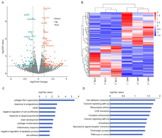 We conducted an RNA-seq of normal shBRCA1 and shSCR DFs to explore the molecular influences of BRCA1 inhibition on normal DFs, which revealed 97 downregulated and 104 upregulated genes in shBRCA1 DF samples (Figure 4A,B). The functional enrichment analysis of these DEGs revealed many Gene Ontology (GO) terms and pathways (Figure 4C,D) that could influence keloid formation, such as collagen fibril organization and the negative regulation of cell proliferation. Additionally, Gene Set Enrichment Analysis (GSEA) identified many activated and repressed hallmarks associated with keloid formation after BRCA1 inhibition (Figure S4). This implies that BRCA1 suppression could induce the perturbation of keloid-related molecular events in normal DFs, potentially representing a keloid pathogenesis factor.