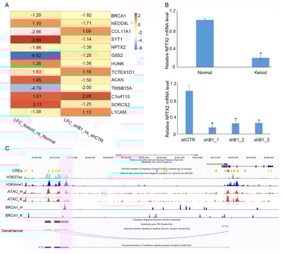 Previous reports have implicated BRCA1 in transcriptional regulation through multiple molecular mechanisms. Therefore, we explored whether BRCA1 suppression induced keloid formation by regulating other genes. We intersected DEGs in keloid samples and shBRCA1 normal DF samples and obtained 13 overlaps, including some well-known keloid or other fibrotic disease-related genes, such as COL11A1 [] and NEDD4L [] (Figure 5A). Interestingly, NPTX2, a synapse formation-related gene recently implicated in abnormal cell proliferation and migration in multiple cancers [,], was significantly inhibited in keloids and shBRCA1 normal DF samples (Figure 5B). This indicated that BRCA1 might influence DF behavior by regulating NPTX2. We performed a BRCA1 CUT&Tag-seq in keloids and normal DFs to further investigate the regulatory relationship between BRCA1 and NPTX2. We found a significant BRCA1 binding signal in the NPTX2 enhancer region of the normal DFs but not keloid DFs (Figure 5C). Furthermore, the ATAC-seq signal in this region in normal DFs was higher than that in keloid DFs. The GeneHancer database [] illustrated a reliable interaction between this enhancer and the NPTX2 promoter (Figure 5C). Given the previous reports on BRCA1 in chromatin remodeling [], we proposed that BRCA1 suppression in keloids attenuated the accessibility of the NPTX2 enhancer and dismissed the interaction between the NPTX2 enhancer and promoter, resulting in NPTX2 repression. To further validate the role of BRCA1 in chromatin remodeling, we visualized the binding signal of BRCA1 at TP63, a popular target of BRCA1, in both the normal and keloid DF samples along with the H3K4me1 and H3K27ac CUT&Tag as well as the ATAC-seq signals. As a result, consistent with the signal landscape at NPTX2, the binding signal of BRCA1 at TP63 is lower in keloid DF than normal DF and the chromatin is denser at the corresponding region in keloid DF (Figure S5).