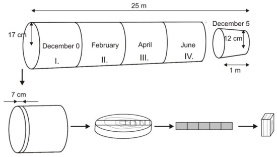 Spruce wood (Picea abies L. Karst) was grown in Lukové (Slovakia). The spruce was felled in December at the height of 0.5 m from the earth’s surface and the sample December 0 was handled in the length of 1 m from the butt cut just after felling. The total length of the roundwood was 25 m. Subsequently, three pieces of roundwood with a length of 1 m were handled apart from the sample named as December 0. They were stored for 2, 4 and 6 months. The sample December 5 was cut 24 m from the butt cut. The estimated age of the spruce was 65 years. During storage, the temperature, relative humidity, and precipitation were measured. A disc with the thickness of 7 cm was cut from the samples. Rectangle-shaped test samples with dimensions of 20 × 20 × 30 mm (radial, tangential, and longitudinal anatomical directions) were cut from the disc (Figure 1). From the rest part of the disc, the sample in the shape of “V” was cut and subjected to chemical analyses.