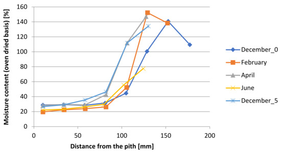 Moisture content in dependence on distance from the pith and during 6-month-long storage.