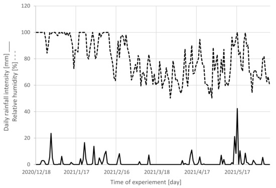Daily rainfall intensity and relative air humidity during the 6-month-long storage.