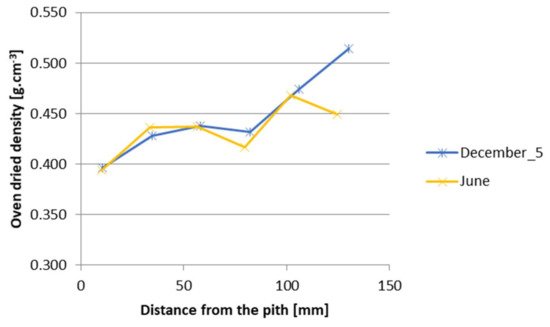 A decrease in density in a dry state after the 6-month-long storage is evident (Figure 5). The decrease in density can be observed on the surface of the roundwood, while in the centre—in the ripewood—only a slight change occurred (Figure 5).