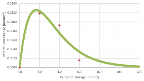 Estimation of the rate of DML change during the storage (red points denote the measured values, green line shows the graph of the Equation (6)).