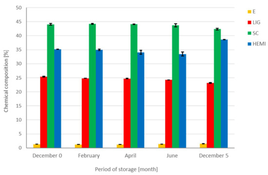 Wood mass loss is a total characteristic. However, the chemical compounds in wood play an important role in processing data. Freshly felled spruce wood contained 1.51% of extractives (E), 80.97% holocellulose, 42.35% of cellulose (SC), 23.17% of lignin (LIG), and 38.62% of hemicelluloses (HEMI). The composition of spruce wood is mentioned in the work of Jeníček et al. [30], Malaťáková et al. [31], etc. The chemical composition of spruce wood after 2, 4, and 6 months of storage is shown in Figure 8. The percentage of hemicelluloses, cellulose, and lignin decreased during storage of spruce wood. Their decreases were probably caused by degradation. The decrease of cellulose and hemicelluloses percentage were observed by Tripathi et al. (2011) [29], also. They explained the change over time due to the free radical formation by UV, atmospheric oxygen, and degradation by bacteria, fungi etc.