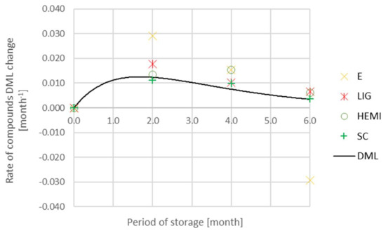 Following the gathered results of chemical composition, it can be stated that the changes in the number of substances occur during the storage of spruce wood. The definition of DML is based on the density in the dry state, the Equations (4) and (5). However, the loss of chemical substances can be calculated when Equations (4) and (5) are completed with the mass concentration of chemical substances instead of the density in the dry state. The result of the calculation is shown in Figure 9.