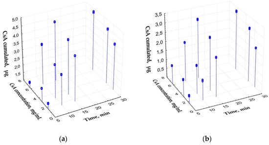 where M—amount of cumulated CsA (μg); t—time of exposure (min; t ≤ 15 min); c—initial concentration of CsA in dilution (mg/mL; c ≤ 6.3 mg/mL).