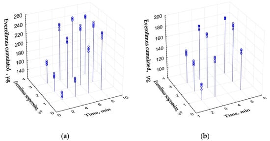 where M—amount of cumulated everolimus (μg); t—time of exposure (min); c—initial suspension concentration (%).
