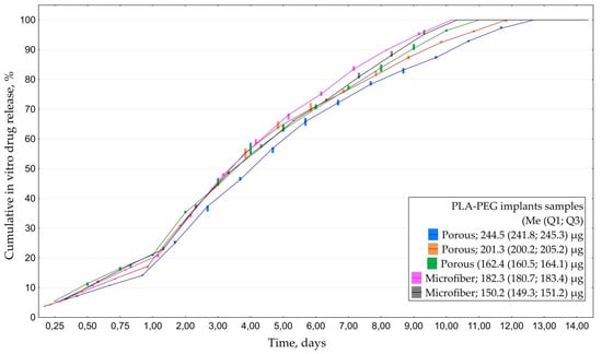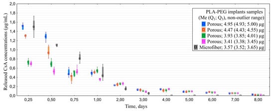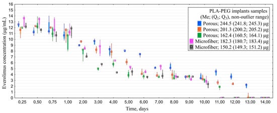 All of the examined implants saturated with everolimus released the drug for 10–14 days. Similarly to experiment with CsA, porous models provided longer-term desorption than microfiber ones: 12.0 (11.0; 13.0) vs. 10.0 (10.0; 10.0) days (Figure 6). Maximal detected concentration of everolimus was 14.5 µg/mL.