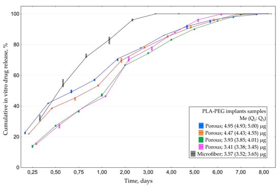 Analyses of cumulative drug release revealed that all of the samples released 45–50% of the drug within the first three days. Residual amount of the drug from porous samples was released within the following 8–10 days depending on the initial amount of everolimus cumulated by the implants. Overall drug release from microfiber samples took 10 days (Figure 7).