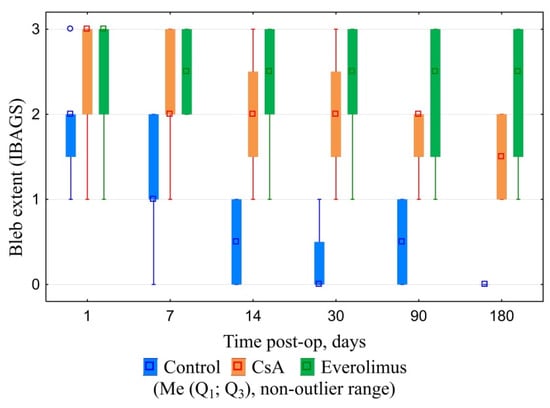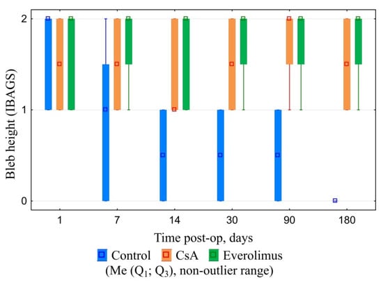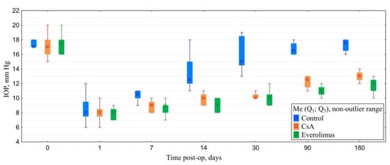 Baseline IOP did not differ significantly between groups. Filtration surgery resulted in marked decrease of IOP levels in all of the animals. During the follow-up, IOP level in controls tended to grow gradually reaching near-baseline values. IOP increase in CsA group was much slower. By the end of follow-up, IOP values at this group were significantly lower compared both with baseline and control. The most stable hypotensive effect was observed in the everolimus group. Everolimus group IOP levels were significantly lower when compared to baseline and control. However, despite a lower median and interquartile range, no statistical differences with the CsA group were revealed (Figure 12).