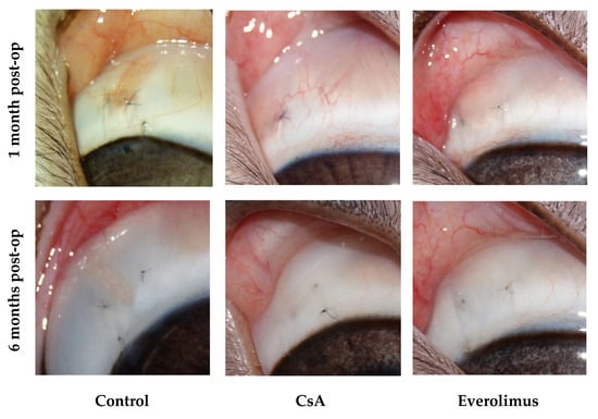 CsA and everolimus groups were characterized by slow gradual bleb shallowing during the whole follow-up period. Nevertheless, they maintained their functional activity even six months after surgery. Their height and extent, graded in accordance with IBAGS, were significantly higher in comparison with controls, ranging from one to three points in three and six months post-op. No bleb leakage was registered. Control group blebs revealed first signs of scleral-conjunctival adhesion at day seven post-op. In one month, 50% of blebs in control group were graded “zero” regarding height and extent (Figure 9, Figure 10 and Figure 11). In six months, all control blebs were flat (Figure 7). Bleb vascularity didn’t differ significantly between the groups. The Seidel test was negative for all of the animals throughout the whole follow-up.