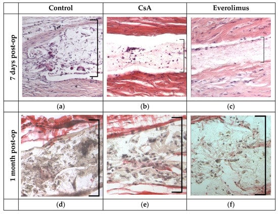 It is likely that due to lower solubility in water and higher initial drug content, everolimus release was almost twice as long as CsA one (i.e., lasting up to 13 days). Such prolonged drug release time is suitable as it overlaps with the period of the most intense T-cell activation and fibroblasts’ acceleration (which are the main effector cells) and does not embrace the period when regulatory immune mechanisms start to limit wound healing.