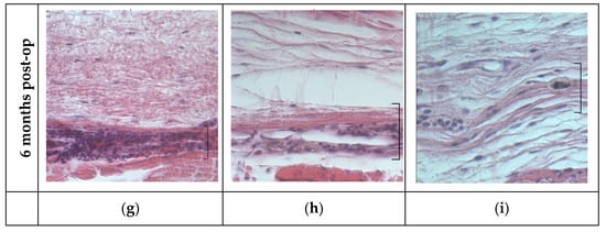 Histological sections of surgery area with implants. Square bracket indicates the implant area. (a–c). Stain: hematoxylin/eosin. Magnification × 100. (d–f). Stain: hematoxylin/picrosirius red. Magnification ×400. (g–i). Stain: hematoxylin/eosin. Magnification ×400.