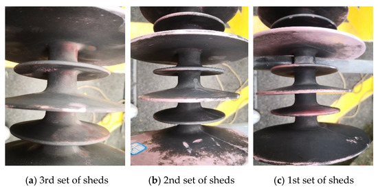 - The sheds’ degradation is concentrated on the side with heavy pollution, with no notable occurrence on the other side. Along the direction of the grounding end, the degree of degradation diminishes. After a long-term operation, due to the hydrophobic migration characteristics of silicone rubber, the two insulators still maintain good hydrophobicity. From the morphology, pollution characteristics, and hydrophobicity, the aging degree of the high voltage side is higher than that of other parts in the same insulator. There is no direct connection between the physical properties of sheds and decay-like fracture of the core rod;