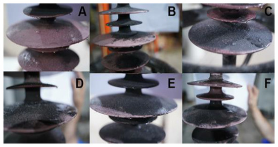 - Hydrophobicity: The spray method was employed according to IEC/TS 62073 and STRI Guide [20,21]. The test process is as follows: firstly, the kettle is used to spray water on the insulator surface, and then the hydrophobic classification (HC) level is determined by observing the surface water droplet state through visual observation;