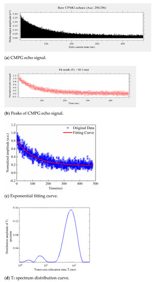 - Nuclear Magnetic Resonance (NMR): NMR means that under the external magnetic field, the nuclear magnetic moment of matter atom undergoes energy level splitting, and the absorbed energy undergoes energy level transition. NMR detects the physical and chemical properties of the material by applying a pulsed magnetic field to the material and measuring the pulse reflected wave signal [22]. The low field nuclear magnetic resonance measurement platform [23] was employed for the nuclear magnetic detection of samples. Experimental equipment mainly includes a Kea2 nuclear magnetic resonance spectrometer (Magritek, Wellington, New Zealand), a Radio Frequency power amplifier (BT00500 ALPHA-SA, Tomco, Stepney, Australia), a duplexer module, a computer, and a unilateral nuclear magnetic resonance sensor. The system parameters of the magnetic resonance analyzer were set up. For each sample, the CPMG pulse was continuously measured three times, and the transverse relaxation time T and peak area of each peak were retrieved [24,25];