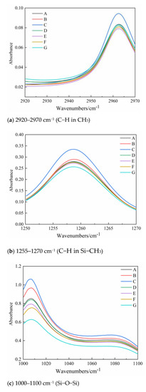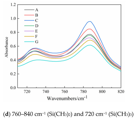 - Figure 10c indicates that at the wavenumber of 1000–1100 cm−1, the corresponding functional group is Si−O−Si, and the change in the absorption peak is identical to that of methyl (−CH3);